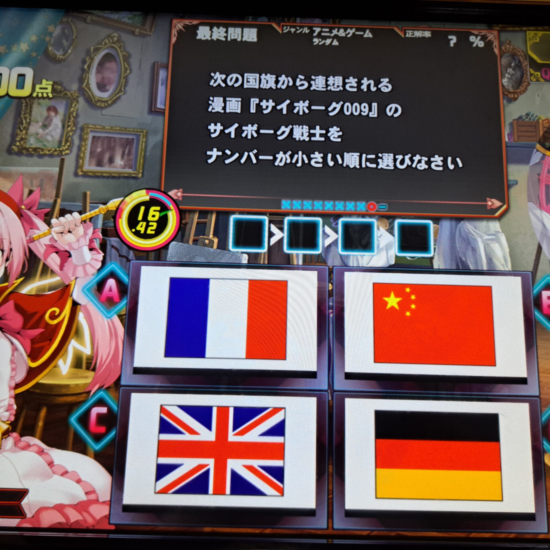 | 次の国旗から連想される漫画『サイボーグ009』のサイボーグ戦士をナンバーが小さい順に選びなさい |
